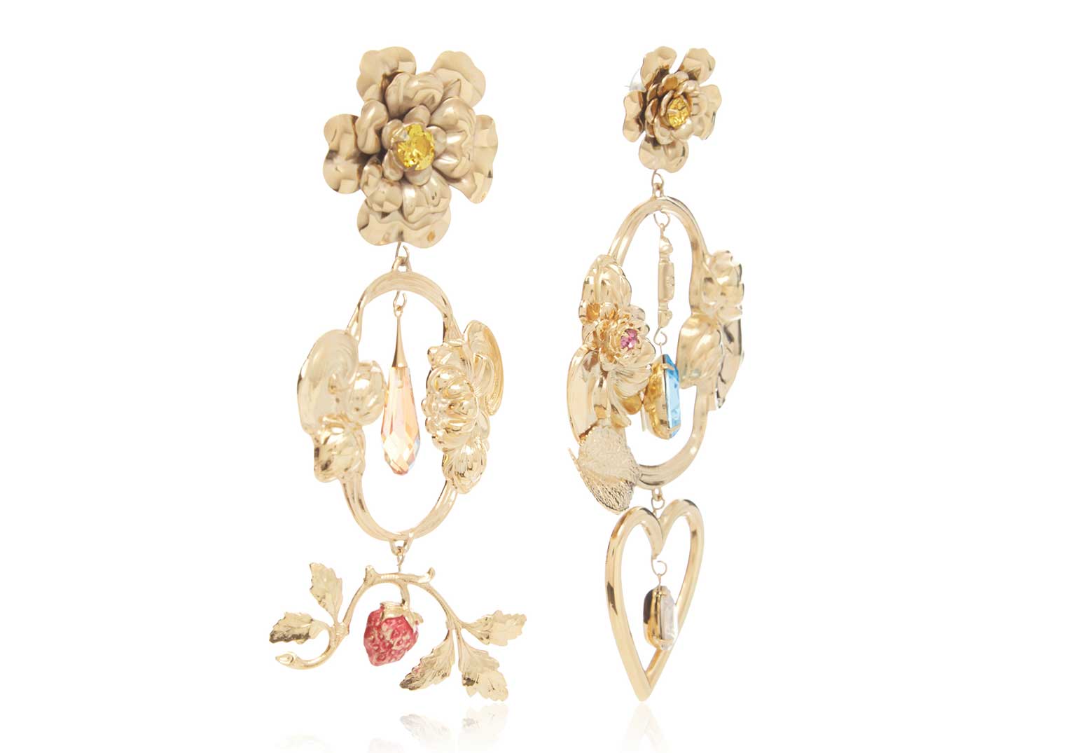 Rodarte Gold Baroque Floral And Heart Dangle Earrings With Swarovski Crystal Details
